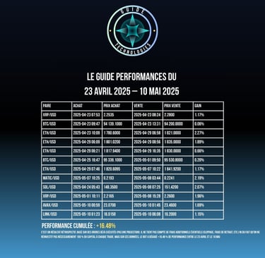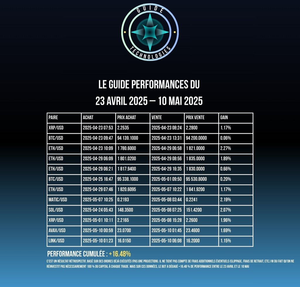Entre le 23 avril et le 10 mai 2025, Le Guide a repéré plusieurs bonnes occasions d’achat et de revente, avec une performance totale de +16,48 % (Les performances passées ne préjugent pas des performances futures.)