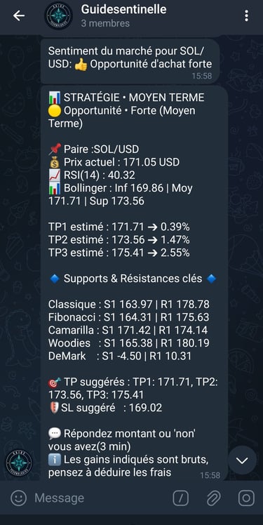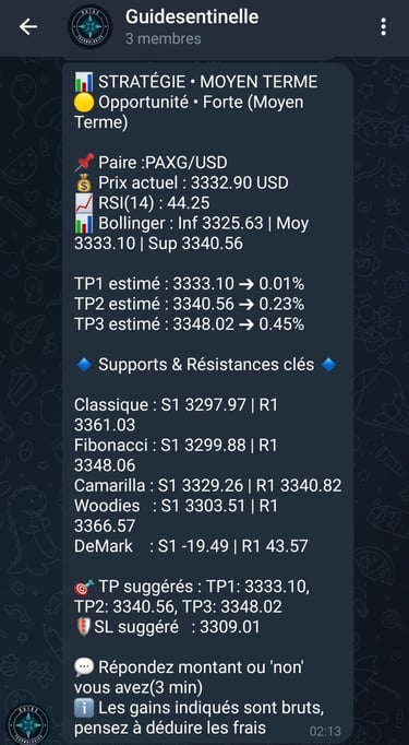 Dès qu’un signal fort est détecté, vous recevez une alerte claire, structurée autour de trois niveaux de prise de bénéfices, issus d’une analyse technique rigoureuse.