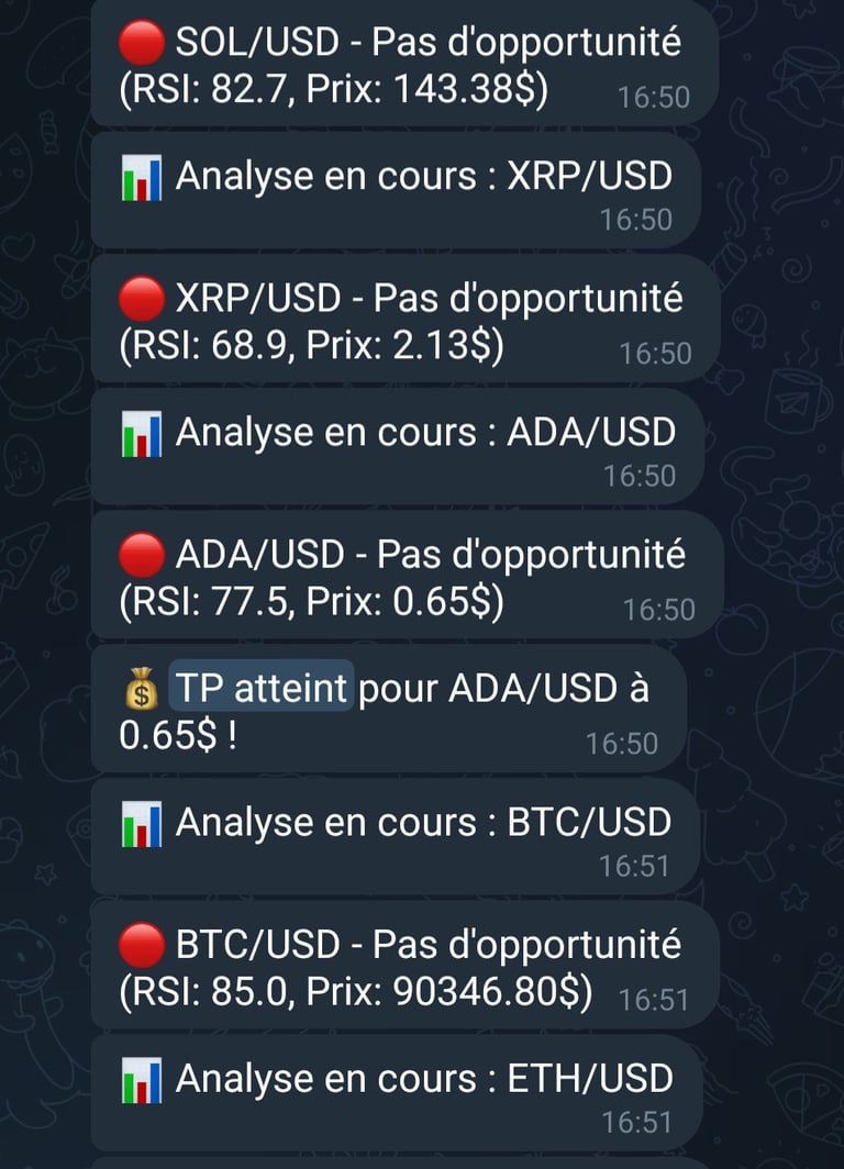 Ces résultats proviennent de vrais signaux envoyés par le bot, sur des paires comme ETH, XRP, AVAX ou SOL.