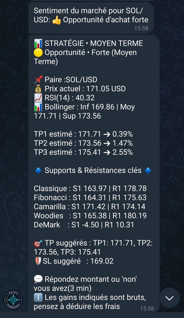 Chaque signal est présenté sous forme de message structuré : paire concernée, prix d’entrée, niveaux de take profit, stop loss, stratégie active.